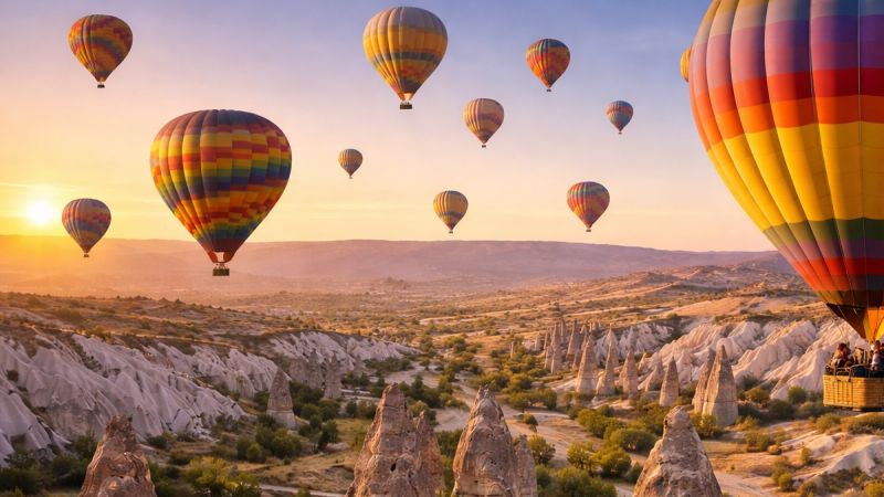 Kapadokya’nın gökyüzünü süsleyen rengârenk balonlarla unutulmaz bir yolculuğa çıkın. Gün doğumunda başlayan bu büyüleyici sıcak hava balonu deneyiminde, eşsiz manzaraların keyfini çıkarın ve uçuşunuzu şampanya ile taçlandırın.